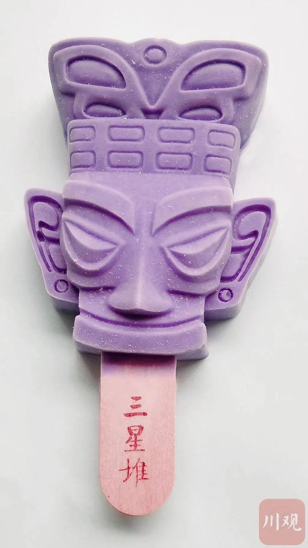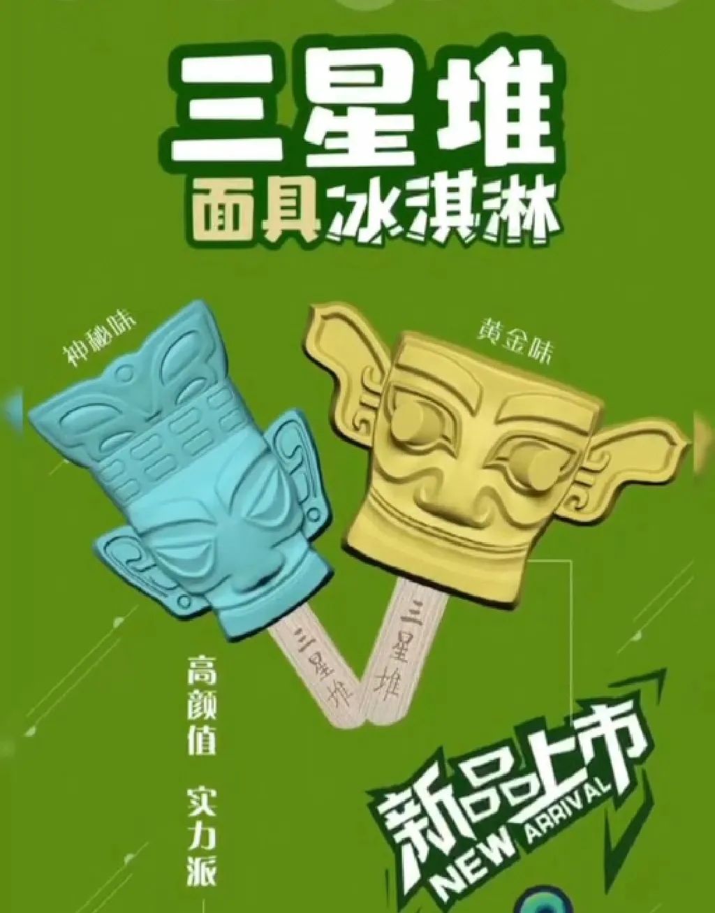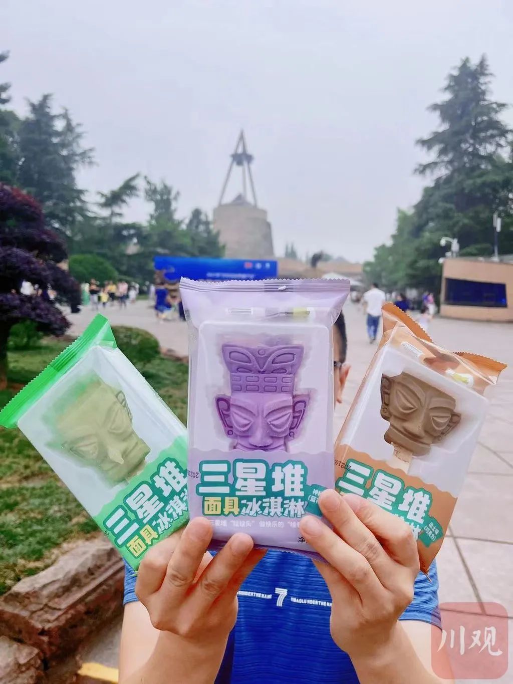 在今年“五一”小长假期火出圈的“面具冰淇淋”是以三星堆“平头金面具”和巨型青铜“大面具”为原型,有“青铜味”和“出土味”两种。这次以青铜“大立人”、青铜“纵目面具” 等国宝级文物为原型设计的新款冰淇淋也先后加入到三星堆面具冰淇淋“娃娃头”大家族中,共同为三星堆“代言”。