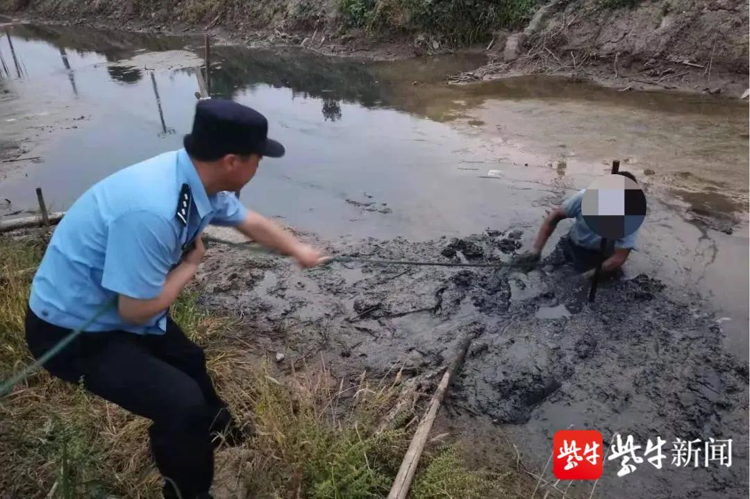 到达现场后,只见一位中年男子半截身子陷在淤泥里无法动弹。事不宜迟,民警立即对其进行营救,一边安慰潘某的情绪,让其保持趴着的双手放平,防止因挣扎后越陷越深;一边将绳子系在他身上,通过合力拽拉的方式经过十分钟的努力,成功将潘某拉上岸。