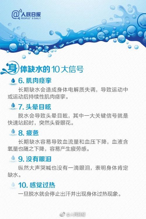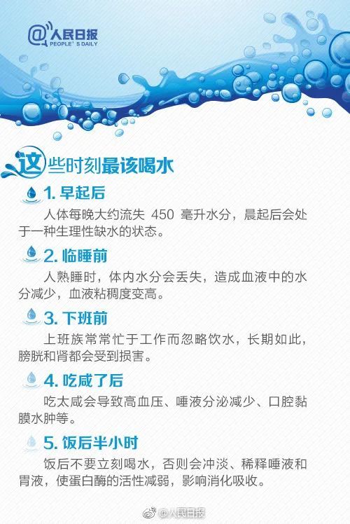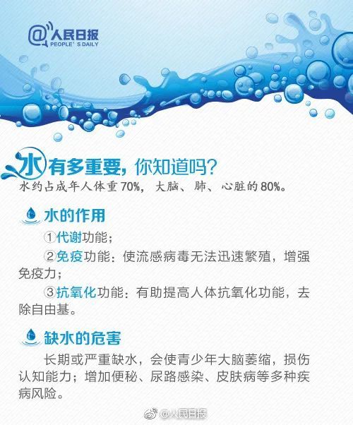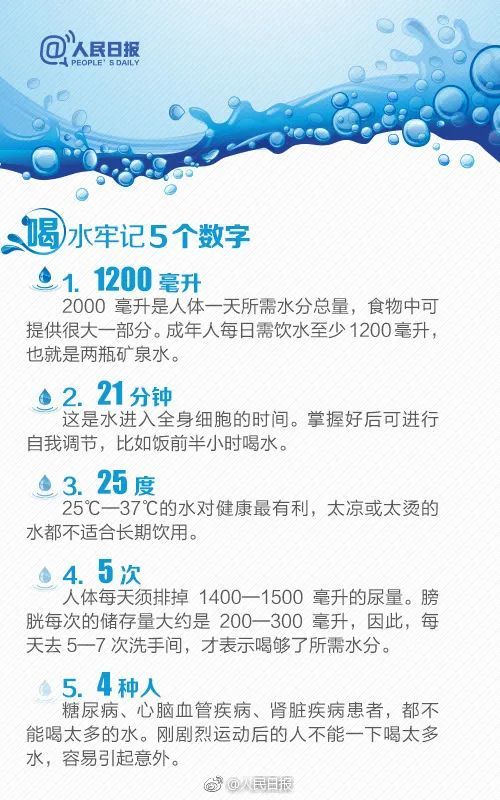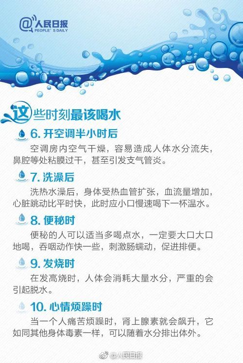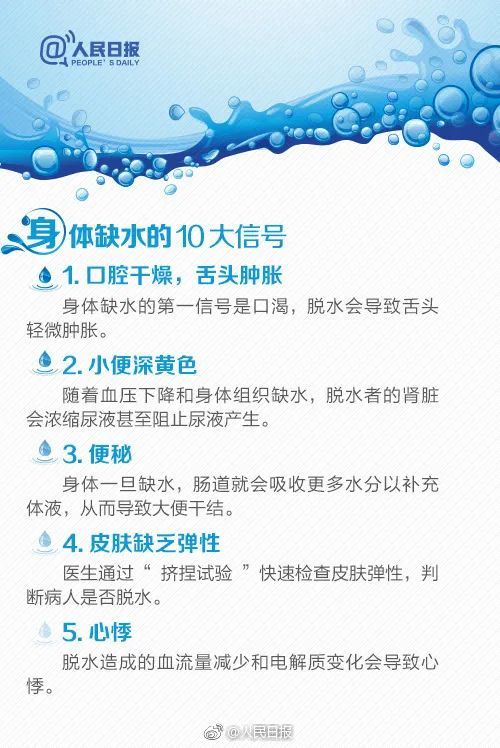 正常人每天应饮水2000ml以上,尿的颜色以清亮无色或微黄为好。在天气干燥、气温高、出汗多时,饮水量还要增加,因为这时尿中溶质浓度水平往往较高。睡觉前、早晨起来、一天三餐后一小时左右,这几个点一定要记得喝水。