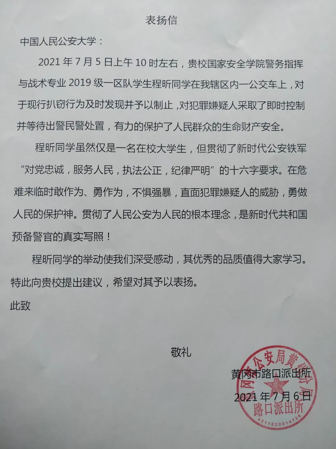 向学校发来表扬信