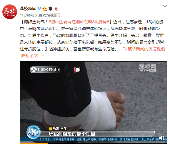 近日,江苏宿迁,15岁的初中生马鸣考试结束后,去一家网红蹦床体验馆玩,海绵垫漏气跳下时脚触地受伤。经医生检查,马鸣的右脚脚背断了三根骨头。医生介绍,头部、颈椎、腰椎是人体的重要部位,从高处坠落下来以后,如果姿势不对,瞬间的暴力会引起脊柱骨折脱位,引起神经损伤,甚至瘫痪或有生命危险。