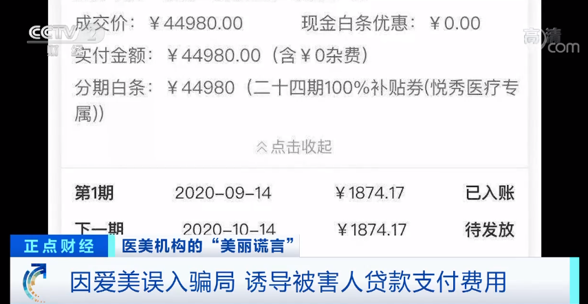 本来,潜在客户因为爱美而入局,殊不知,当他们到了悦秀医美后,便会被接待人员一系列的花言巧语弄得晕头转向,等到犹豫不决之际,这家整容机构便会诱导被害人通过贷款的方式支付整形费用。