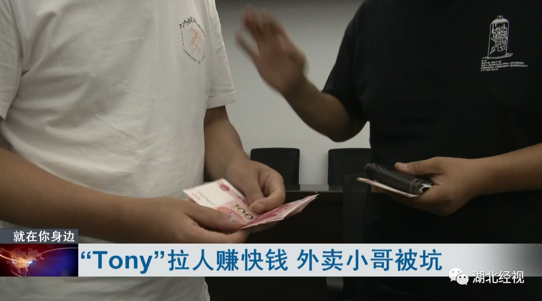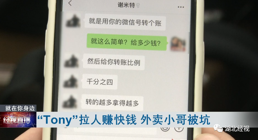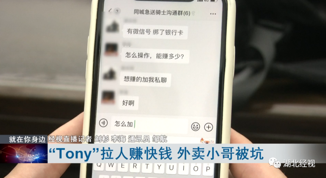 据贾某介绍,7月9日晚他在“同城急送骑士沟通群”里看到一个昵称叫“Tony”的人发消息。说是有个赚快钱的生意可以做,感兴趣的私聊。添加“Tony”成为好友后,对方告诉他赚外快的办法很简单。别人把钱转给他,他再通过微信转回去就行。贾某听了很心动,于是前往江夏区藏龙岛跟“Tony”见了面。