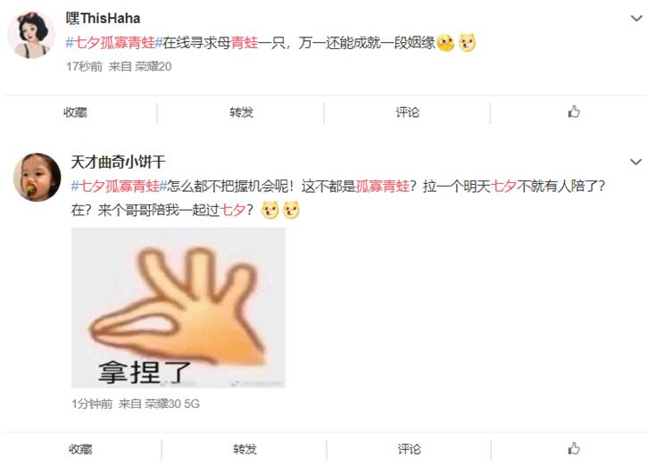 而#七夕孤寡青蛙# 话题,也随着这些讨论冲上了微博热搜。↓