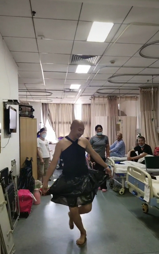 第三次去上海治疗时,7月15日下午,赵新志输完液,剪开床边的黑色塑料袋,围成芭蕾舞裙,把黑色背心的背带交叉着穿,模仿芭蕾舞剧《天鹅湖》里的演员,踮脚起跳。那时候,病友们已经知道“33床那人挺爱拍视频”,赵新志征得病友同意后,病友家属也开始配合他。