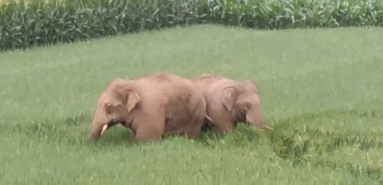 亚洲象监测员杨忠平8月11日上午用手机拍摄了一段视频:在一片玉米地里,两头亚洲象正在悠闲地吃着地里的玉米,吃饱后,又慢悠悠地走出玉米地,消失在附近的树林中。这两头亚洲象离开没几天,又来了一个象群,有17头大象。杨忠平说,一般亚洲象都是下午来食物源基地,一直吃到第二天早上。