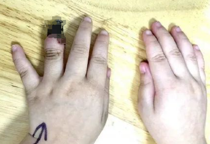 直到3天后,欢欢的父亲出差回家,才发现欢欢的左手无名指出现明显肿胀,末端已经发黑。