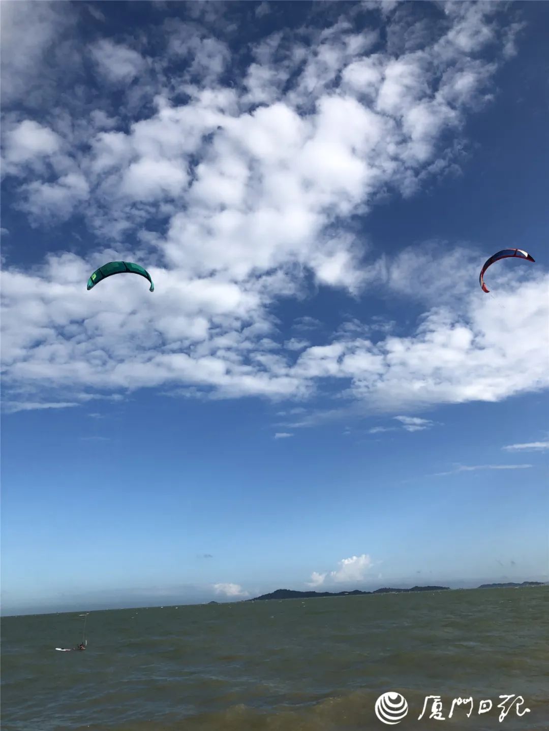 黄厝沙滩附近,不少人在海上玩滑翔伞。(受访者 供图)