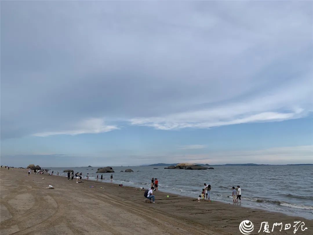 黄厝沙滩附近,滑翔伞项目附近区域游人众多。(记者拍摄供图)