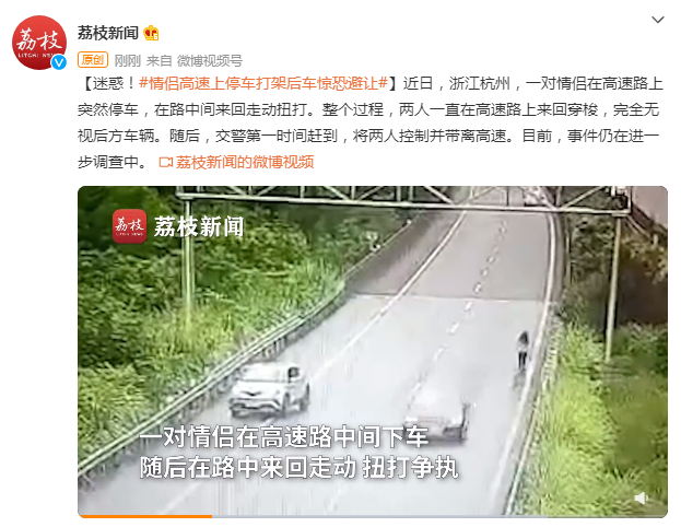 近日,浙江杭州,一对情侣在高速路上突然停车,在路中间来回走动扭打。整个过程,两人一直在高速路上来回穿梭,完全无视后方车辆。随后,交警第一时间赶到,将两人控制并带离高速。目前,事件仍在进一步调查中。