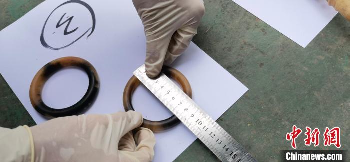图为民警在测量白犀角手镯直径。 付浩 摄