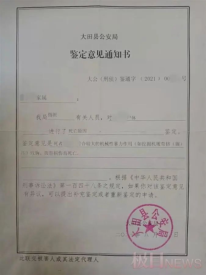 然而黄永成并不认可这份《鉴定意见通知书》。“我爸爸的胸口和背上并无明显伤痕,十几吨重的挖掘机碾在人身上,人都能被压扁了。”黄永成说,反倒遗体被发现时,他看到父亲头部有伤痕。