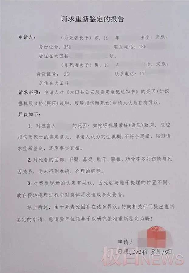 8月10日,黄永成向公安机关申请对其父的死亡原因重新鉴定。在黄永成提供的《请求重新鉴定的报告》中,他认为“死者的面部、下颌、鼻梁、脑干、腰椎、肋骨等多处伤情与死因关系,尚未得到明确解释。”