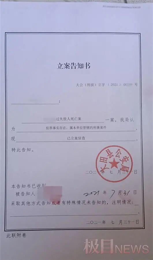 大田县公安局还于7月31日出具了一份《立案告知书》,“洪高阳过失致人死亡案”已立案调查。