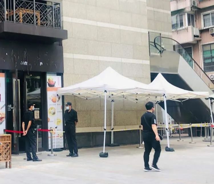 在绿光少儿教育通河校区所在的商业体一楼的一间店面有些格外显眼,这里门前不仅站着两位保安,还有排队所用的隔离栏、遮阳伞,这就是为维权家长们临时开辟的登记处,原本绿光少儿教育所在的三楼教室早已大门紧闭。
