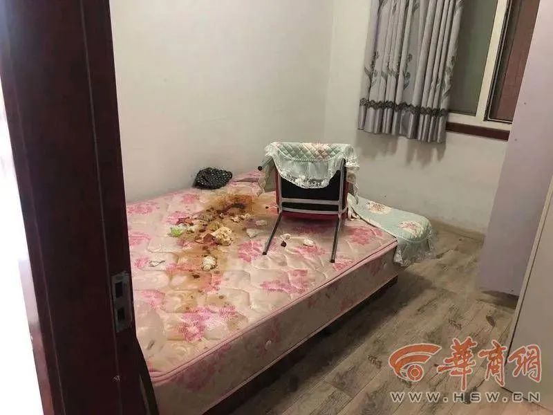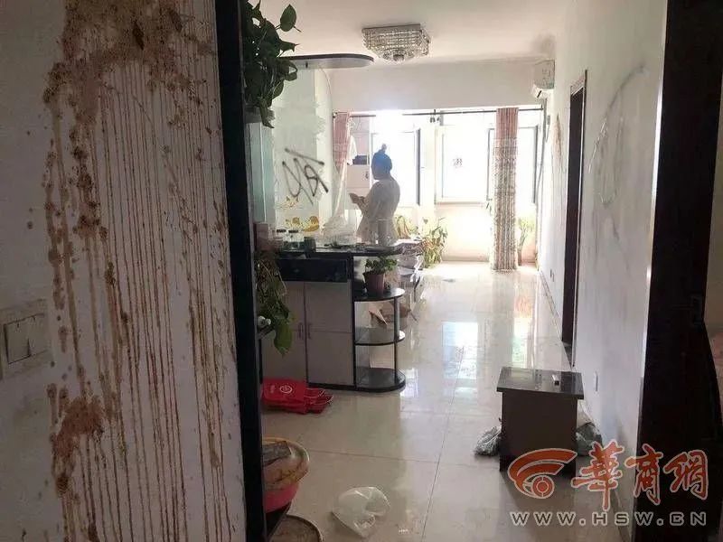 9月8日上午,秦女士的房子虽然经过了简单的清理,但一进去就能闻见臭味,门厅墙壁被油漆污染,客厅的墙上还有红色的“死”字,卧室的床上有大量疑似粪便的异物。