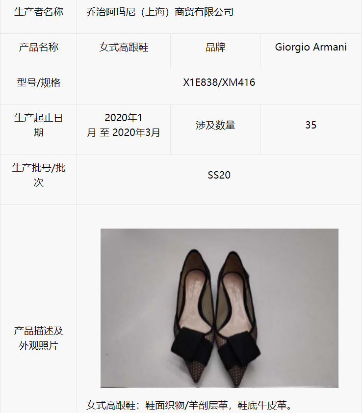 报道称,乔治阿玛尼将召回型号规格为X1E838/XM416,生产批次为SS20的女士高跟鞋,共计35双。