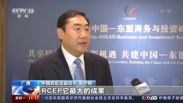 中国贸促会副会长 张少刚: RCEP它最大的成果,是把整个原来亚太地区分散在15个国家的市场或者两两对应的这个国家的市场融合成一个规则统一的、市场统一的这么一个大市场。不仅是会对亚太地区的经济复苏产生作用,而且也会对整个世界的经济发展产生非常积极和有力的推动作用。(总台央视记者 周旋 王雷善涛继华世玉世军张军高淼王楠 宁宁理天广西台)