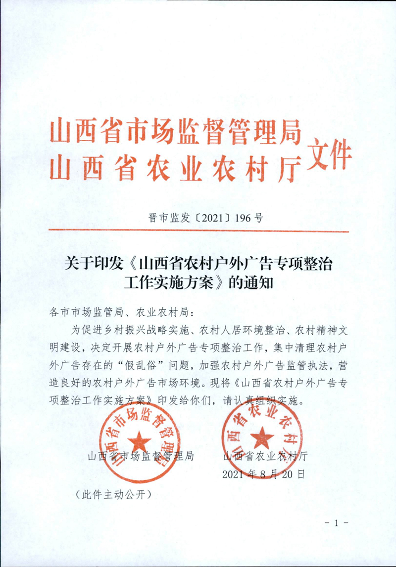 日前,山西省市场监督管理局和山西省农业农村厅联合发布《山西省农村户外广告专项整治工作实施方案》,方案要求开展农村户外广告专项整治,集中清理农村户外广告存在的“假乱俗”问题,同时加强农村户外广告监管执法,营造良好的农村户外广告市场环境。方案要求将在11月20日前重点整治5项农村户外广告: