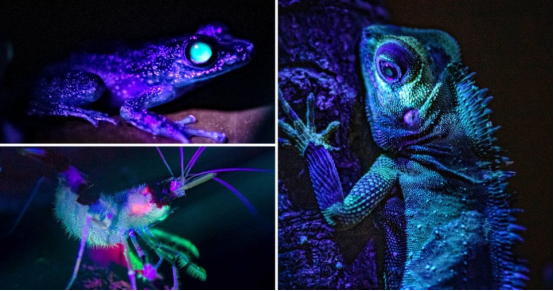 动物园拍摄的夜间图像显示,变色龙、蜥蜴、青蛙、鱼、蜗牛等生物在紫外线照射下呈现出鲜艳的红色、蓝色和绿色。专家解释说这类现象是由动物皮肤中的蛋白质、色素和化学物质反应引起的。