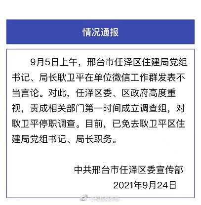 9月24日,邢台任泽区委宣传部发出官方通报:9月5日上午,邢台市任泽区住建局党组书记、局长耿卫平在单位微信工作群发表不当言论。对此,任泽区委、区政府高度重视,责成相关部门第一时间成立调查组,对耿卫平停职调查。目前,已免去耿卫平区住建局党组书记、局长职务。