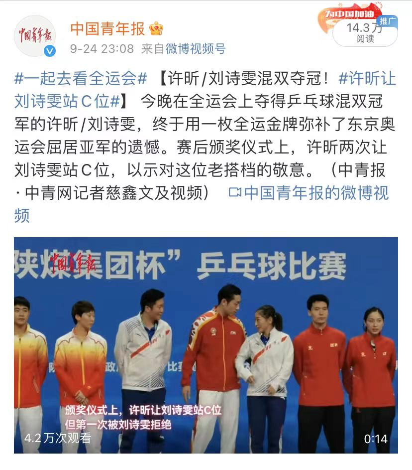 24日晚,第十四届全运会乒乓球混双决赛,奥运组合许昕/刘诗雯成功摘得金牌,弥补了东京奥运会屈居亚军的遗憾。