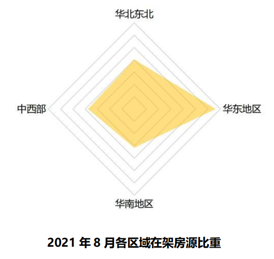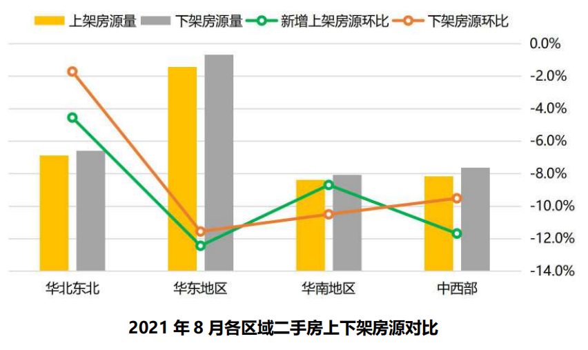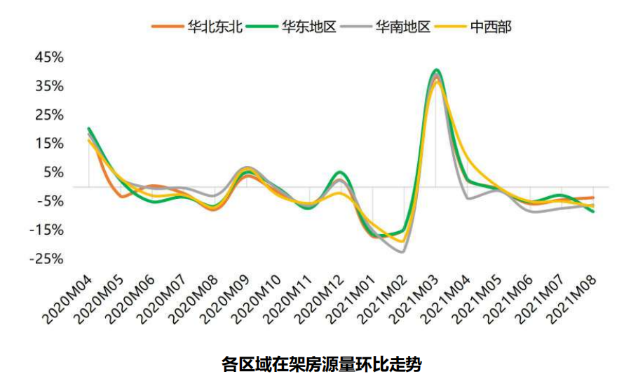 从各区域在架房源的环比变化看,都出现了不同程度地下跌,其中,华东地区下滑幅度达8.6%,超过了之前一直下滑趋势较大的华南地区。