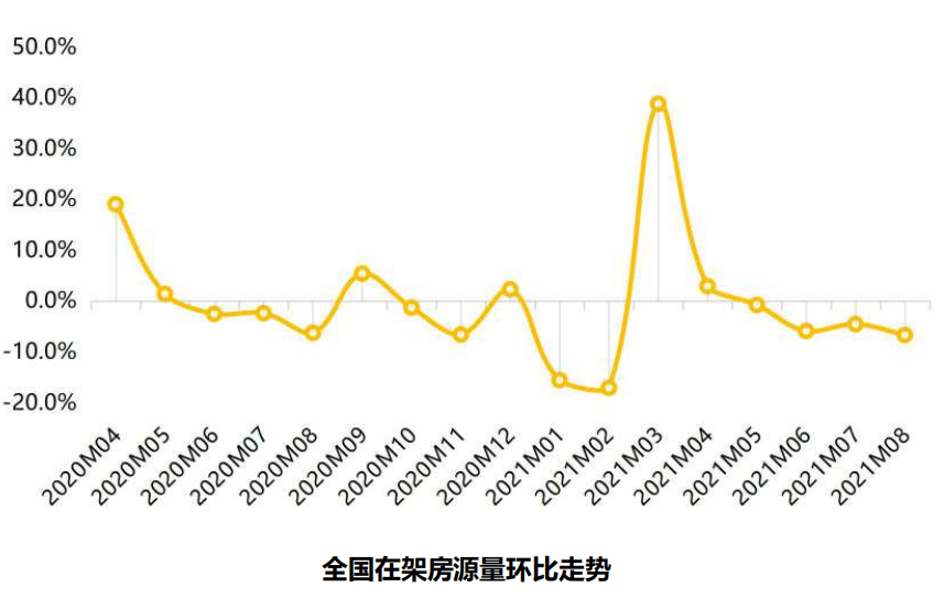 从在架房源来看,2021年8月,监测的65城二手房在架量继续下滑,下滑幅度为6.7%,绝对值为近6个月最低。
