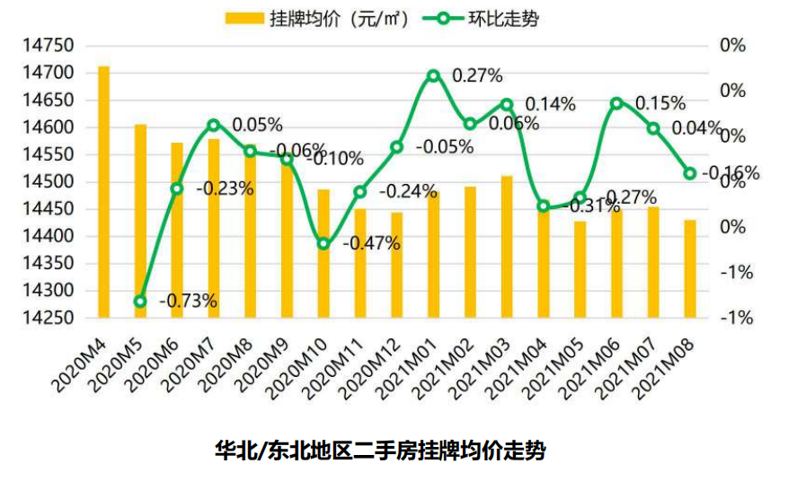 分区域来看,华北/东北地区价格近一年出现明显波动下滑,8月挂牌均价为14431元/平米,基本持平上月。