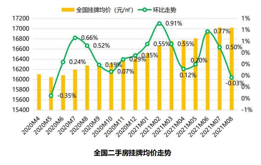 8月,全国二手房挂牌均价为17020元/平米,持续攀升之势止步。