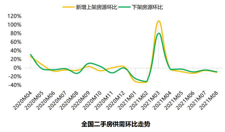 全国二手房市场基本保持供需平衡,新增上架和下架的房源继续呈现环比下滑趋势,且下滑幅度再次扩大。其中,新增上架房源本月环比下滑近10个百分点,而下架房源则下滑9个百分点,均为近6个月来最低。