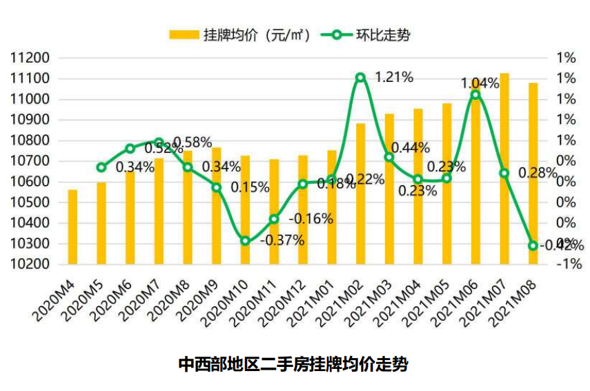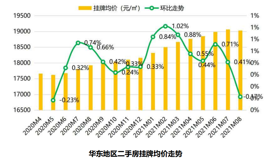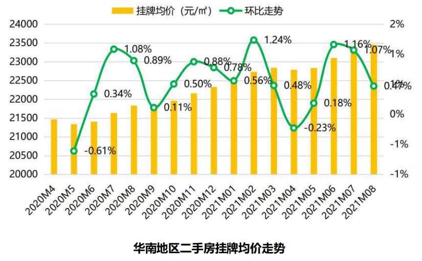 其中,华东地区8月挂牌均价19031元/平米,环比下滑0.17%,同比上扬6.16%;华南地区挂牌均价23455元/平米,环比上扬0.47%,同比上扬7.43%;中西部挂牌均价11081元/平米,环比下滑0.42%,同比上扬3.07%。