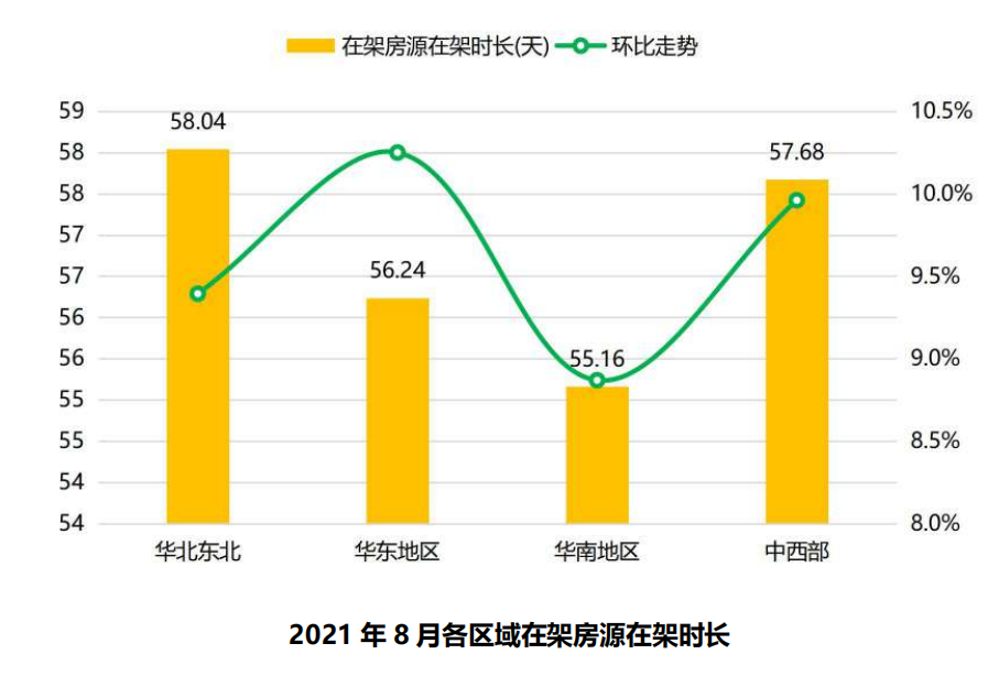 从各区域情况看,8月各区域房源的在架时长都环比出现上扬,从具体数据看,华北/东北、华东、华南、中西部地区房源的在架时长分别为58天、56天、55天、58天,环比上扬幅度分别为9.4%、10.2%、8.9%、10%。