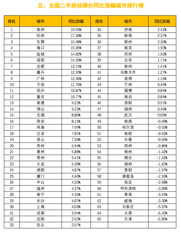 具体来看,华北/东北地区、华东地区、华南地区、中西部分别下滑3.7%、8.6%、6.3%和6.7%。从具体城市看,上述提到的11个下滑幅度超一成的城市中,居前5位的都是华东地区城市。其中,宁波已经连续两个月居首,和上海的房源在架量下滑幅度15%以上。