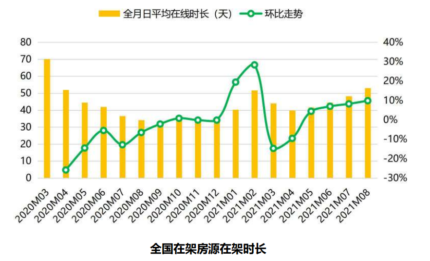 从在架时长来看,8月全国二手房在架时长为53天,环比上扬10%,为3月份以来的新高,同比上扬幅度达54%。