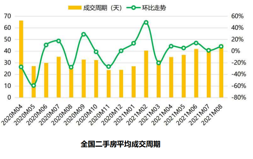 从全国二手房成交周期走势来看,8月全国二手房成交周期为46天,环比上扬8%,创下去年5月份以来的新高。