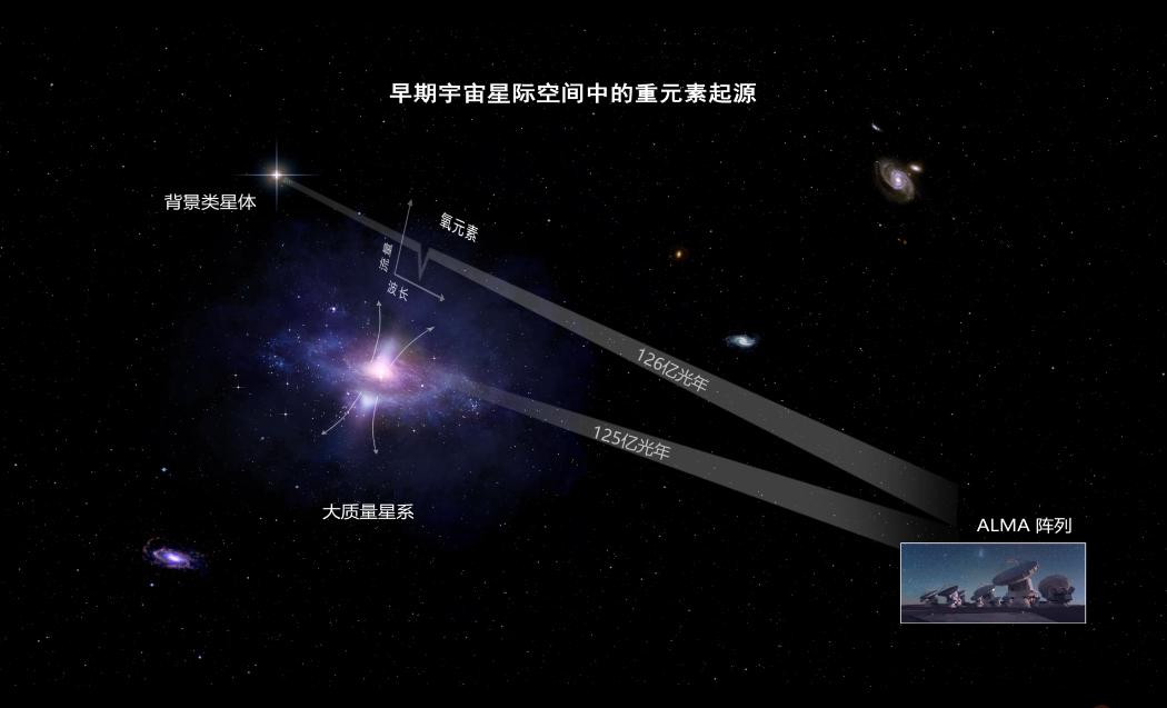 科研团队利用位于智利北部,国际上最大的射电望远镜阿尔玛阵列,对“宇宙早期重元素起源”问题进行了深入研究。在进行了仔细地数据分析和处理后,团队发现一个距离地球约125亿光年的候选星系,这个星系的光度约为太阳光度的1亿倍。星系喷出大量的重元素氧位于该星系的暗物质晕边缘,距离该星系约6万光年。观测表明,大质量星系的星风反馈作用可能比之前想的重要。宇宙早期重元素起源,大质量星系的贡献比先前所预测的要重要得多。这项科研成果为宇宙星际空间重元素起源之谜提供了新的见解。据悉,科研工作得到科技部重点研发计划,国家自然科学基金委,清华大学实验室处、科研院等单位的支持。