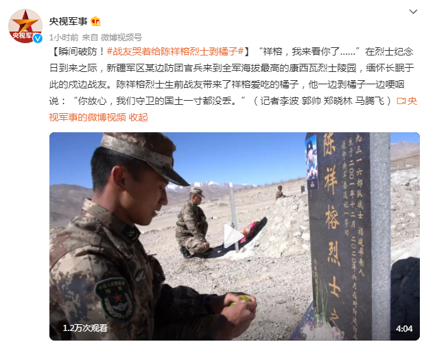 【瞬间破防!#战友哭着给陈祥榕烈士剥橘子#】“祥榕,我来看你了……”在烈士纪念日到来之际,新疆军区某边防团官兵来到全军海拔最高的康西瓦烈士陵园,缅怀长眠于此的戍边战友。陈祥榕烈士生前战友带来了祥榕爱吃的橘子,他一边剥橘子一边哽咽说:“你放心,我们守卫的国土一寸都没丢。”(记者李波 郭帅 郑晓林 马腾飞)
