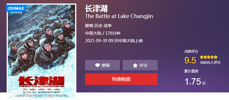 9月30日,2021电影“国庆档”正式开启。率先上映的《长津湖》预售总票房突破1.5亿,以猫眼淘票票双平台9.5分的超高评分正式开画。观众走进影院感受176分钟的震撼与感动,截至9月30日11时,影片观影人次达到202.1万。并且已经打破多项影史纪录,包括“国庆档”影片战争片首映日票房纪录、国庆档影片首映日场次纪录、国庆档影片历史片累计票房纪录。