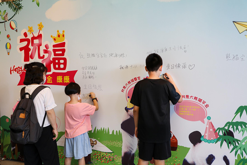 上海野生动物园介绍,这三只大熊猫雪宝、芊金和康康都出生在10月上旬。为了让大熊猫感受节日氛围,大熊猫保育员在10月2日这天给它们一起庆生。另外,大熊猫馆还特别设置了祝福墙,希望来园的游客写下最真挚的祝福。