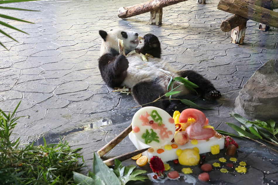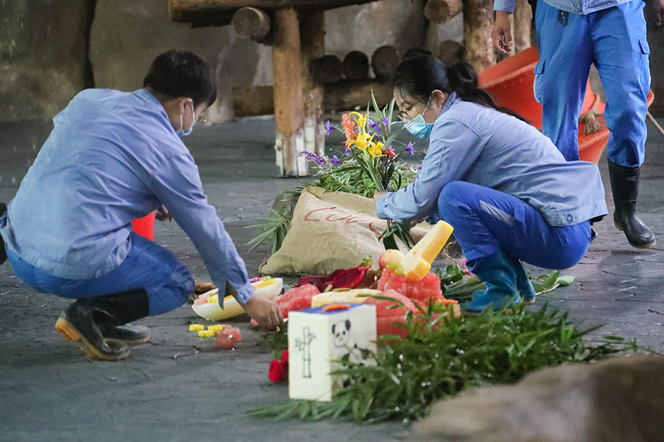 保育员给大熊猫布置生日会场。