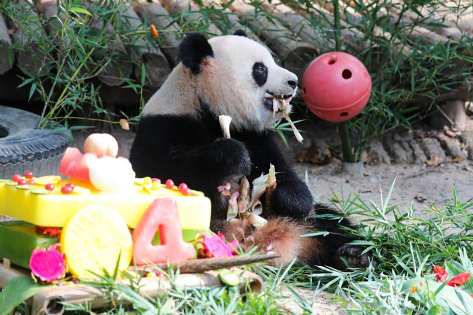 4岁的大熊猫雪宝和芊金面对保育员准备的冰果蛋糕只是象征性嗅了嗅,反而对礼物产生了浓厚的兴趣。大熊猫雪宝的礼物是50公斤的特制“杠铃”,它一个猫爪伸过去就捣弄起“杠铃”,随后又慢悠悠地取出藏在“杠铃”里的竹笋,享受起美味来。而芊金则瞄上了保育员们给准备的“竹子口红”和“彩色眼影盒”,在一旁的游客直呼,这位“小主”有做“美妆达人”的潜质。