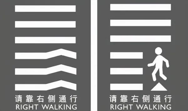 新的设计方案中就包括人行横道右侧加入引导箭头、画上小人,加上“请靠右侧通行”内容。