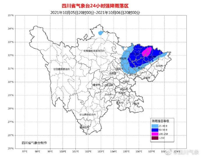四川省气象台10月5日16时00分发布暴雨蓝色预警: 5日20时到6日20时,广元、巴中2市和南充北部、绵阳东部有大雨到暴雨(雨量40~80毫米),局部大暴雨(100~150毫米)。
