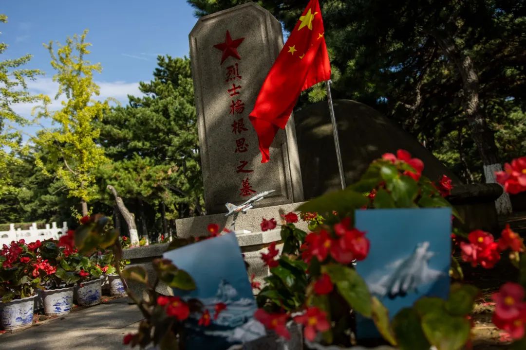 邱少云、黄继光、杨连弟烈士墓前的花丛里,也摆放着中国航母和国产先进战机的照片。