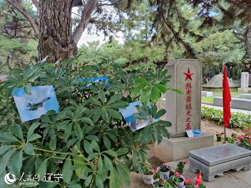 烈士黄继光的墓碑前摆放着国产先进战机的照片。人民网 那其灼摄