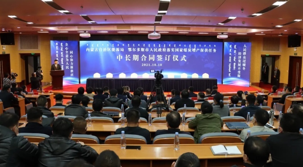 10月10日下午,在内蒙古自治区鄂尔多斯市举行的落实国家煤炭增产保供任务中长期合同签订仪式上,鄂尔多斯市40家煤炭企业与对口保供的黑龙江省、吉林省、辽宁省、天津市等18个省区市、63家煤炭企业,与呼和浩特市、包头市等6个区内盟市分别签订了四季度煤炭中长期保供合同,15家煤炭企业与鄂尔多斯市5个旗区分别签订了冬季取暖用煤保供协议。
