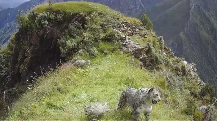 近日,在青海省玉树藏族自治州曲麻莱县境内的通天河流域附近,当地生态管护员通过架设的红外相机记录到了三只雪豹“同框”的影像。