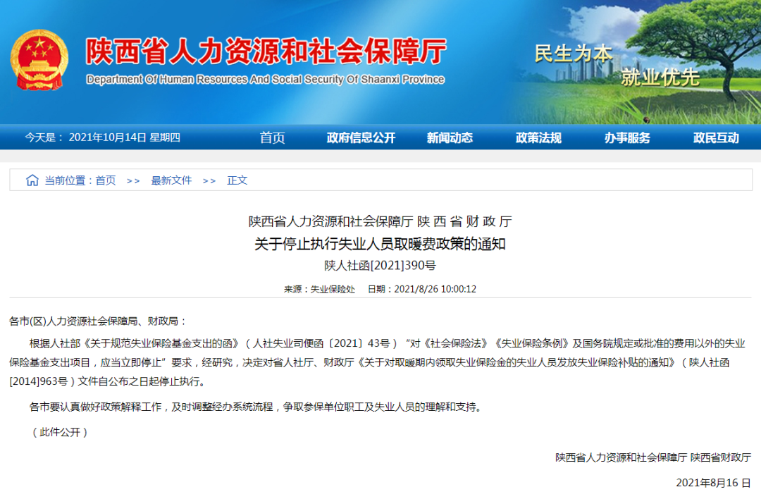 根据人社部《关于规范失业保险基金支出的函》(人社失业司便函〔2021〕43号)“对《社会保险法》《失业保险条例》及国务院规定或批准的费用以外的失业保险基金支出项目,应当立即停止”要求,经研究,决定对省人社厅、财政厅《关于对取暖期内领取失业保险金的失业人员发放失业保险补贴的通知》(陕人社函[2014]963号)文件自公布之日起停止执行。