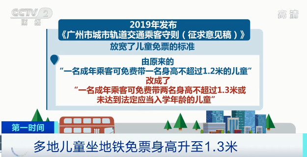 在2019年发布的《广州市城市轨道交通乘客守则(征求意见稿)》中,放宽了儿童免票的标准,由原来的“一名成年乘客可免费带一名身高不超过1.2米的儿童”,改成了“一名成年乘客可免费带两名身高不超过1.3米或未达到法定应当入学年龄的儿童” 。